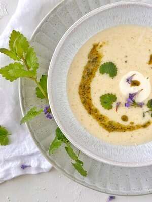Sauerrahmsuppe mit Gundermann-Honig Pesto