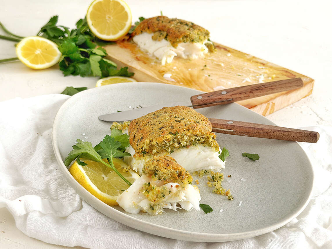 Kabeljau vom Arvenbrett mit Kräuterkruste