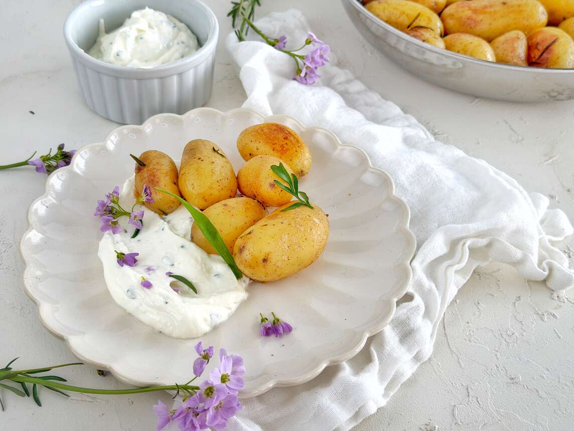 Pommes de terre nouvelles avec sauce à tremper et cardamine des prés